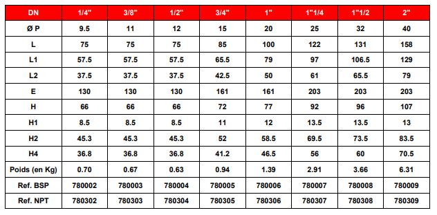 Dimensions : DN 1/2″ à 2″ / Raccordement : Femelle / Femelle BSP