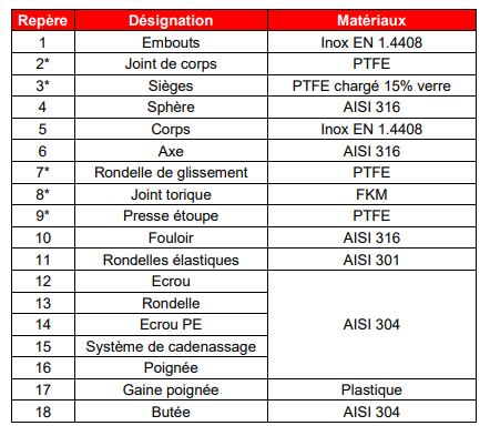 - Sièges : PTFE - Presse-étoupe : PTFE